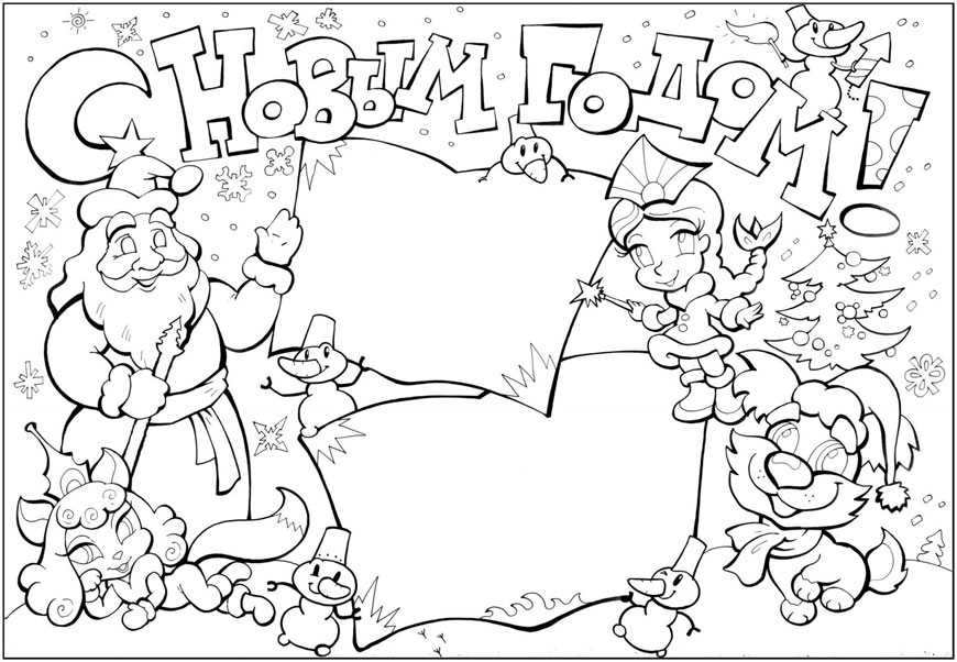 - Классическая стенгазета — подходит для детского садика или школы. На большом листе пишутся новогодние надписи и рисуются изображения разных сказочных персонажей. Рисовать от руки необязательно, можно приклеить шаблоны.