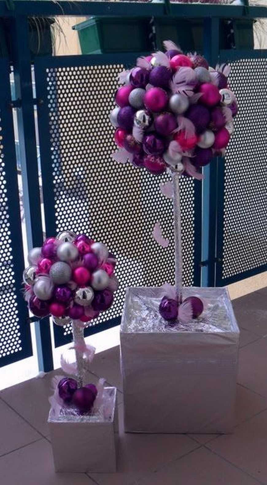 Далее следует прикрепить к стволу основание из пенопласта в форме шара и приступим к самой захватывающей части. Чтобы прикрепить елочные шарики в основу, приклеим их к зубочисткам и аккуратно вставим в шар из пенопласта. Промежутки между большими шарами можно заполнить шариками поменьше, а также другими украшениями и мишурой. Поверхность горшка также украшаем. Чтобы наши украшения хорошо держались, по завершении декорирования склеиваем их между собой.