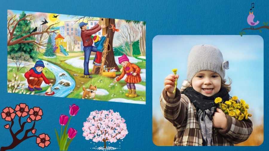 Педагог показывает воспитанникам презентацию изображений, отражающих основные признаки весны: появление проталин, возвращение перелетных птиц, ковер из подснежников и прочее. Демонстрацию сопровождает соответствующим рассказом. После просмотра презентации дети должны развернуто рассказать, по каким признакам можно узнать весну.