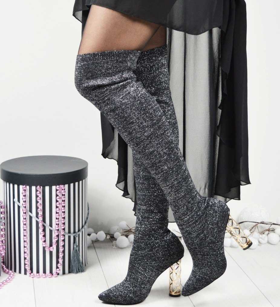 К сапогам-чулкам не подойдут наряды из атласных или блестящих тканей, декорированные пайетками или стразами.