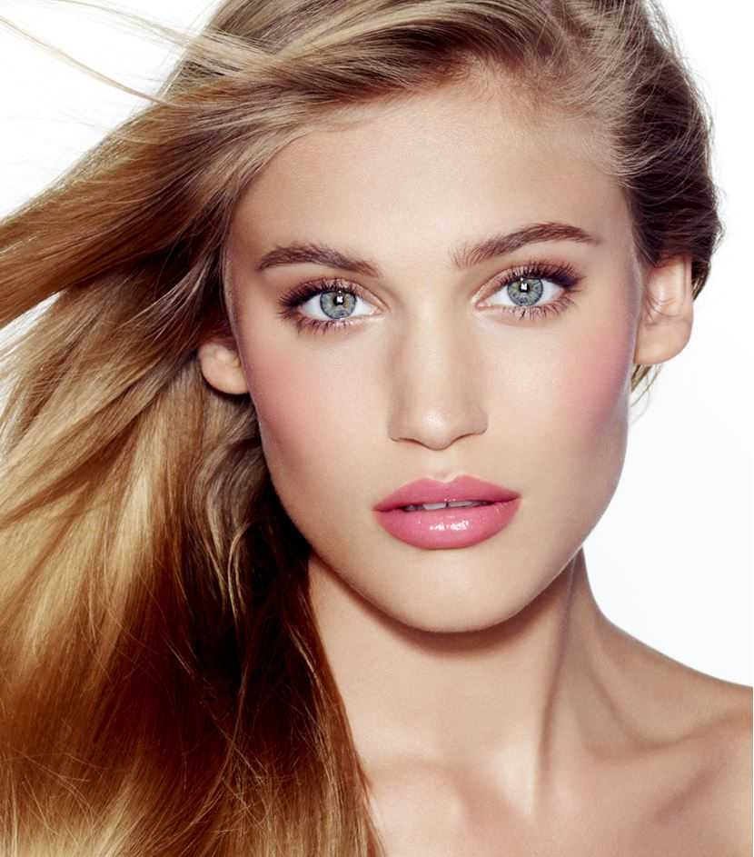 - Подходит блондинкам с голубыми глазами помады нюд телесных оттенков — светло-шоколадный, капучино, золотисто-розовый, розовый и винный цвета.