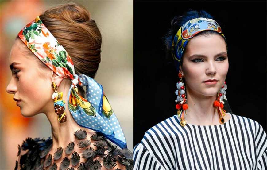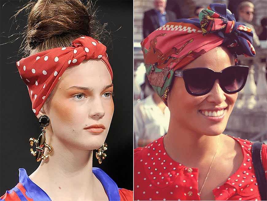 Данный вариант и два последующих подойдут для тёплого времени года в качестве стильного аксессуара. Сверните платок так, чтобы он превратился в узкую повязку. А затем оберните его вокруг головы, немного отступив от линии роста волос и закрепите сзади под волосами. Повязка органично смотрится как с распущенными волосами, так и с различными причёсками. Можно приколоть на повязку впереди брошь или перетянуть резинкой, чтобы она притягивала взгляд.