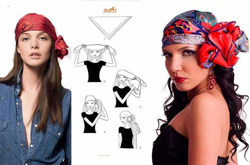 Этот вариант полностью повторяет «пиратку» по технике завязывания. Однако платок здесь нужен другой: длинный (до 140 см), яркий, цветастый. Желательно, чтобы он был сделан из немнущегося материала. Длинные концы сзади можно оставить, а можно завязать в бант.