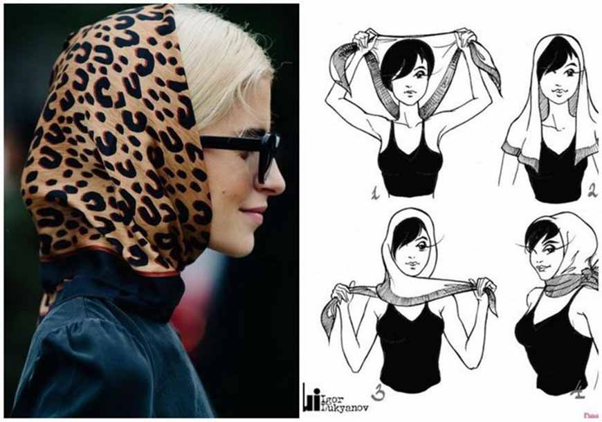 Более простого способа, как завязать платок на голову, просто не придумать! Данный стиль ношения платка прекрасно сочетается с модными очками, а также с кашемировыми пальто или шубкой.