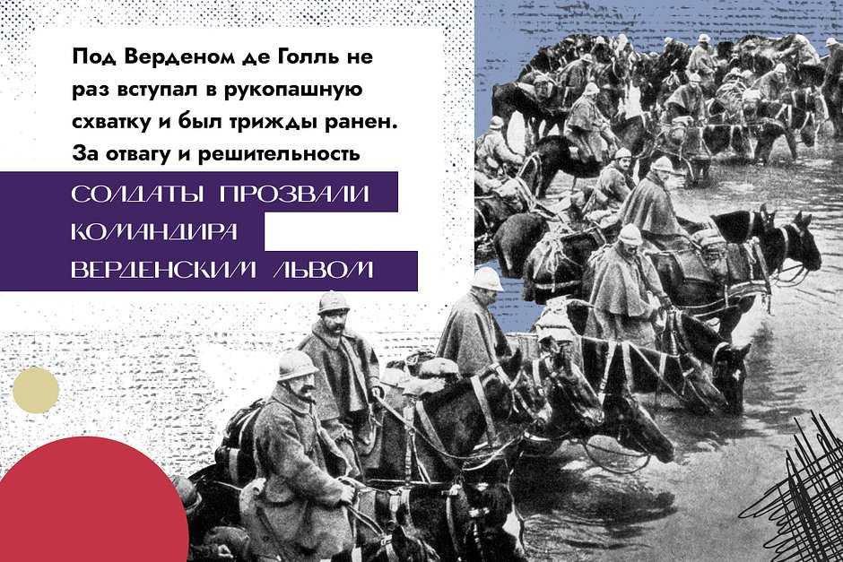 В 1913 году в чине младшего лейтенанта де Голль поступил на службу в пехотный полк, которым командовал тогда еще никому не известный военачальник Филипп Петен. В Первую мировую войну молодой офицер проявил себя настоящим героем, но встретить победу в строю ему не удалось: в сражении, которое позже назвали Верденской мясорубкой, де Голль был ранен и попал в плен. Командование высоко оценило его заслуги, и из плена он вернулся в звании капитана и с высшими военными наградами — орденом Почетного легиона и Военным крестом.