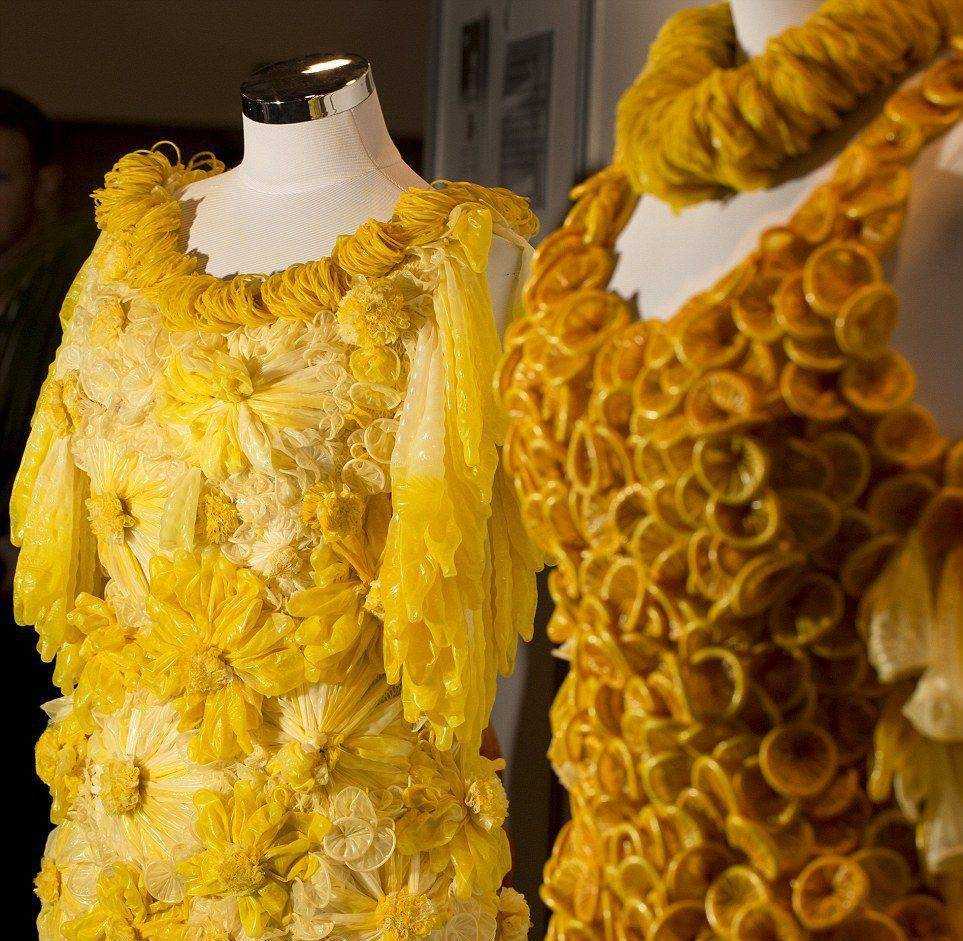 - Среди неординарных идей можно выделить наряды из листьев, разной шерсти, зонтиков и даже камня и глины, а китайцы додумались создать наряд из медицинских масок. Мда, бывают же странные люди. Много платьев и из фосфора. Вообще светящиеся наряды в моде.