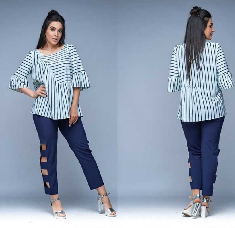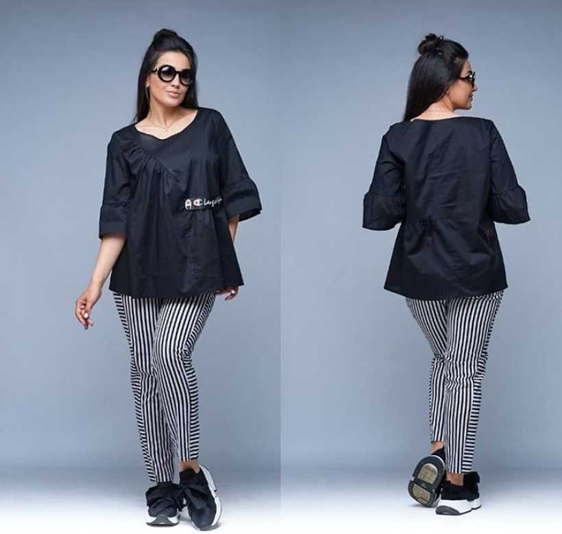 - Блузка-туника. Превосходный фасон, который будет к лицу любой женщине с пышными формами. К такой блузке можно подобрать лосины или узкие брюки. Модели с высокой линией талии пригодятся вам при наличии сильно выступающего животика и складок на боках;