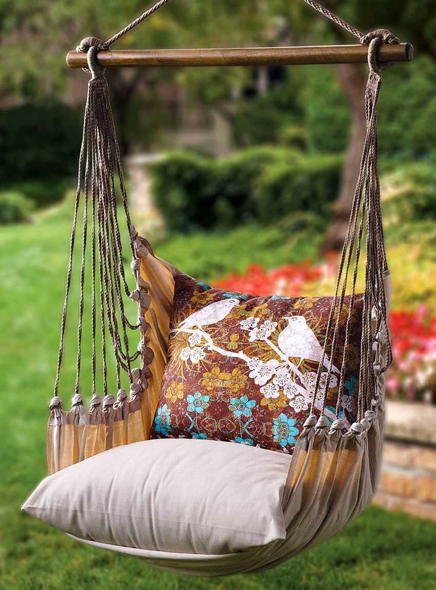 гамачные – подвешиваются на перекладину из металла. В качестве заменителя перекладины может служить дерево с толстой и прямой нижней веткой. Во время использования такой конструкции у человека создается впечатление будто он парит над землей. Подобные качели пользуются большим спросом у тех, кто увлекается чтением книг;