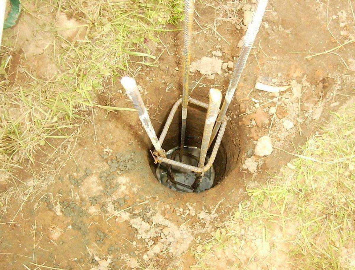 Перед бетонированием в скважину обязательно помещают армокаркас для придания жесткости конструкции, а выступающие над поверхностью арматурные пруты на следующем этапе строительства будут использованы для жесткой связки опор с ростверком.