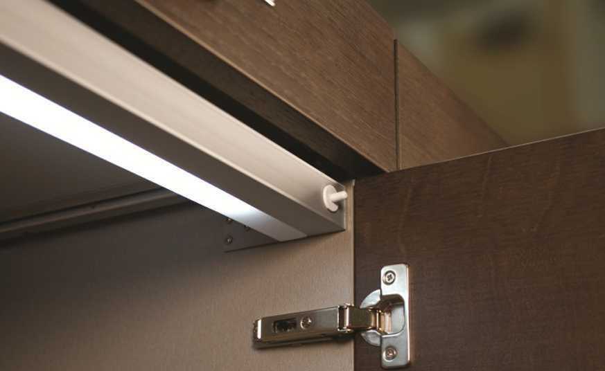 Использовать можно лампы любого типа, но имеет смысл сделать так, чтобы они включались от датчиков движения. Отрыли двери — лампы зажглись, движения нет, они выключились. Есть еще вариант для распашных дверей есть лампы с кнопками, которые зажигаются при открытии двери и выключаются когда они закрыты.
