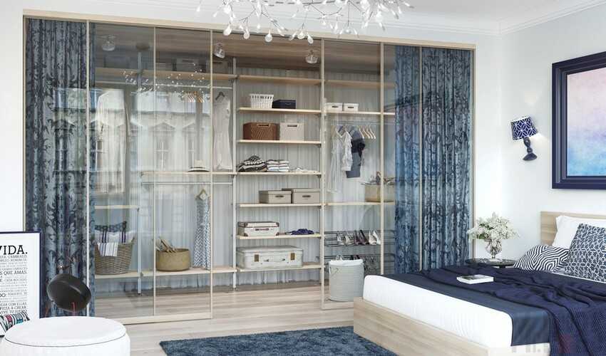В идеале вход в гардеробную должен быть из спальни. Если жилплощадь очень скромная, место хранения можно оборудовать в прихожей, коридоре или даже на лоджии, при условии что она совмещена с комнатой и отапливается.