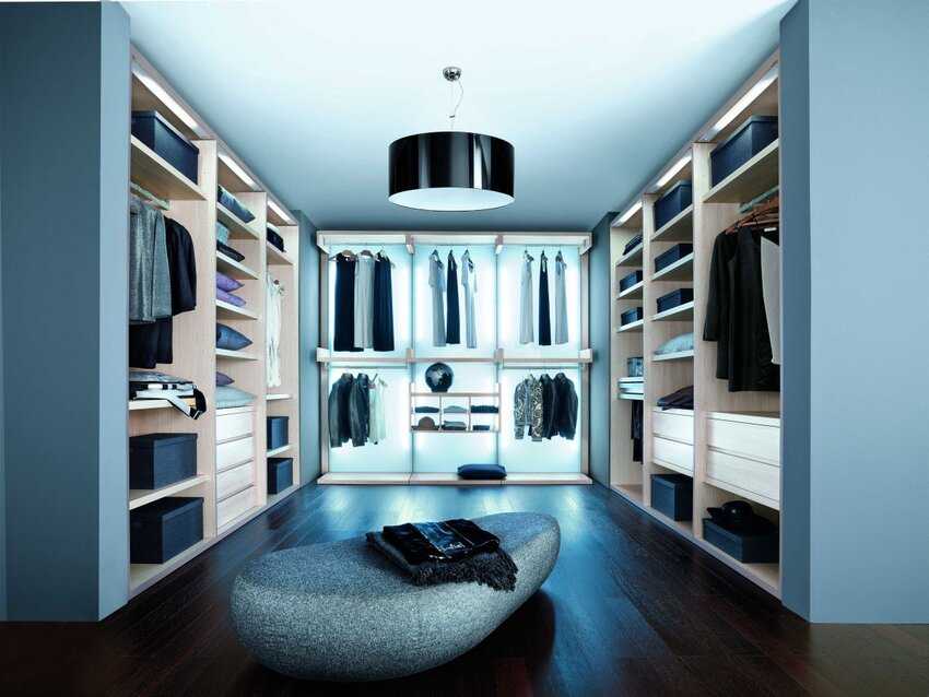 Главными его преимуществами являются наличие специальной области хранения вещей, больший порядок и организация пространства в доме, улучшение интерьера и наличие одежды в одном месте. При этом планировка помещения может быть угловой, П- или Г-образной, линейной и параллельной.