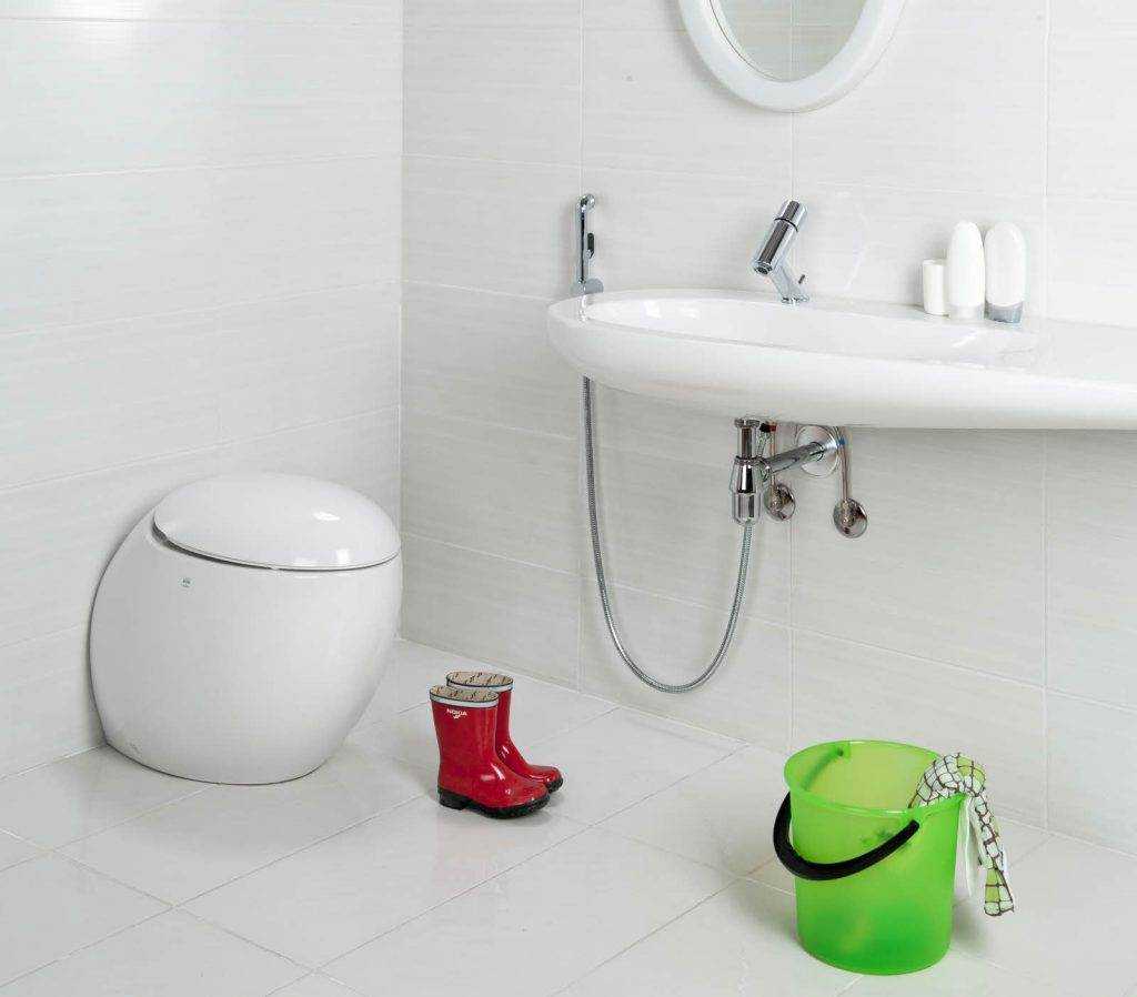 - Он идеально подходит для совмещенных санузлов, где одновременно установлены раковина и унитаз. Причем между ними должно быть небольшое расстояние, чтобы было достаточно шланга смесителя.