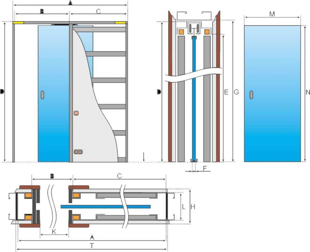 1. Это могут быть две части полотен, которые открываются в обе стороны2. Одна дверь ходит влево или вправо вдоль стены.3. Когда полотно уходит в стену, скрываясь в проеме кармана (пенала) из гипсокартона или готовой металлической кассеты.