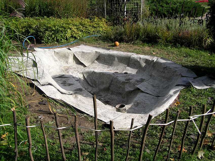 Дно и края полученной ямы утрамбовывают хлопками лопаты. Потом вы снова станете перед выбором, из чего выполнить фонтанную чашу. Материалом для ее создания может послужить бетон. На дренажную подушку ставится гибкая опалубка и в нее заливается жидкий раствор.