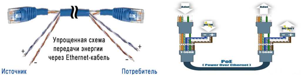 Данная схема позволит помимо информационного сигнала, передать питающее напряжение на свитч, роутер или любое другое устройство. Благодаря этому не нужно будет покупать отдельный провод для подачи питания. В распиновки коннектора rj-45, синий и коричневый провод применяют для подачи электричества. Вы спросите, а где это нам пригодиться? Отвечаю: при установки видеонаблюдения, подачи электричества на коммутатор. Многие, из которых рассчитаны принимать питание из разъема rj-45. И так далее.