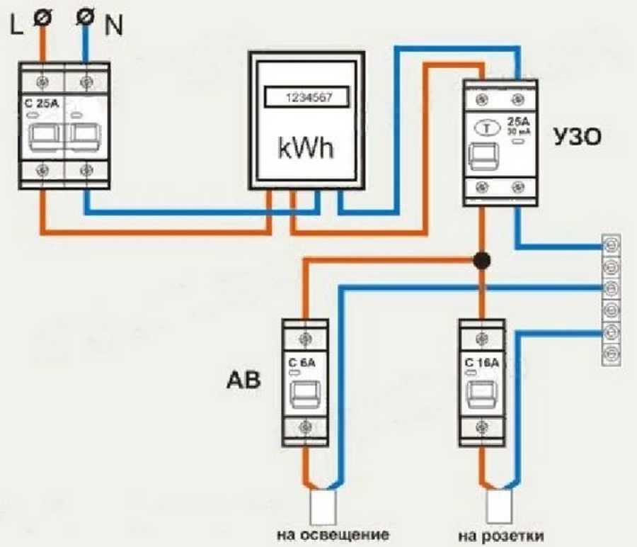 По линии ноля кабель отходит к зажимным колодкам, а после чего разветвляется по потребителям. На данном изображении отсутствует нулевая шина, что часто встречается в квартирах и домах ранних годов постройки. Здесь будет актуальна схема с использованием нескольких защитных устройств к каждой точке потребления.