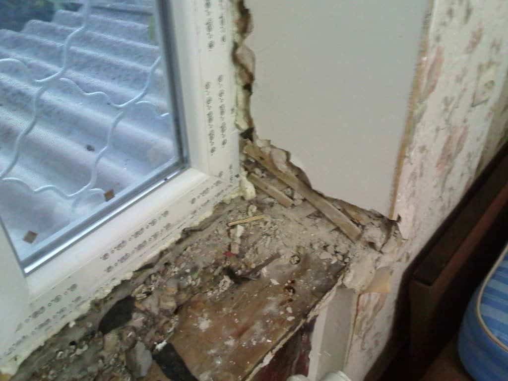 оконный проем внимательно осматривается. При наличии участков с плесенью или почернением проводятся работы по их удалению — сбивается штукатурка или часть стены, после чего наносится антисептический состав;