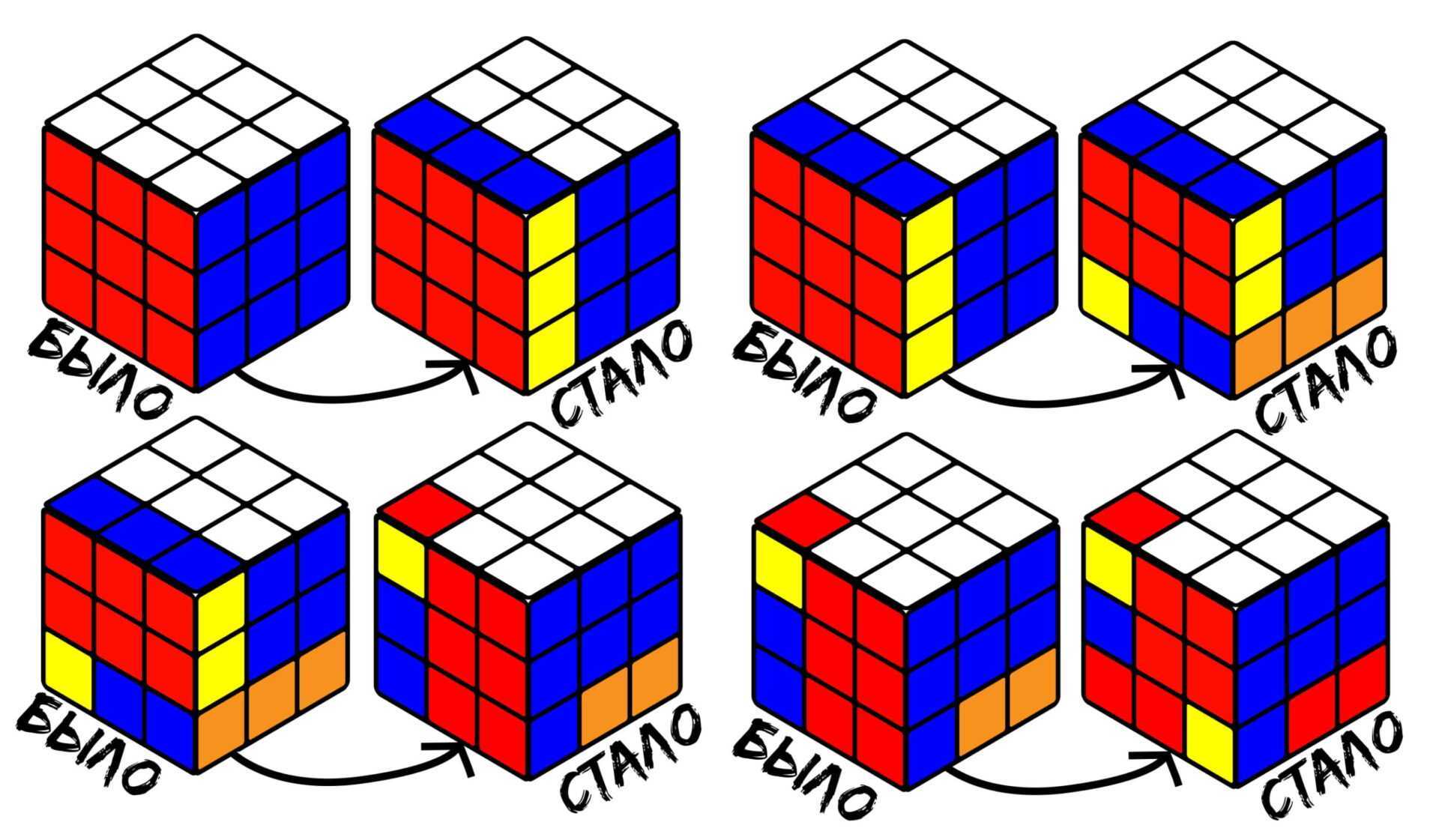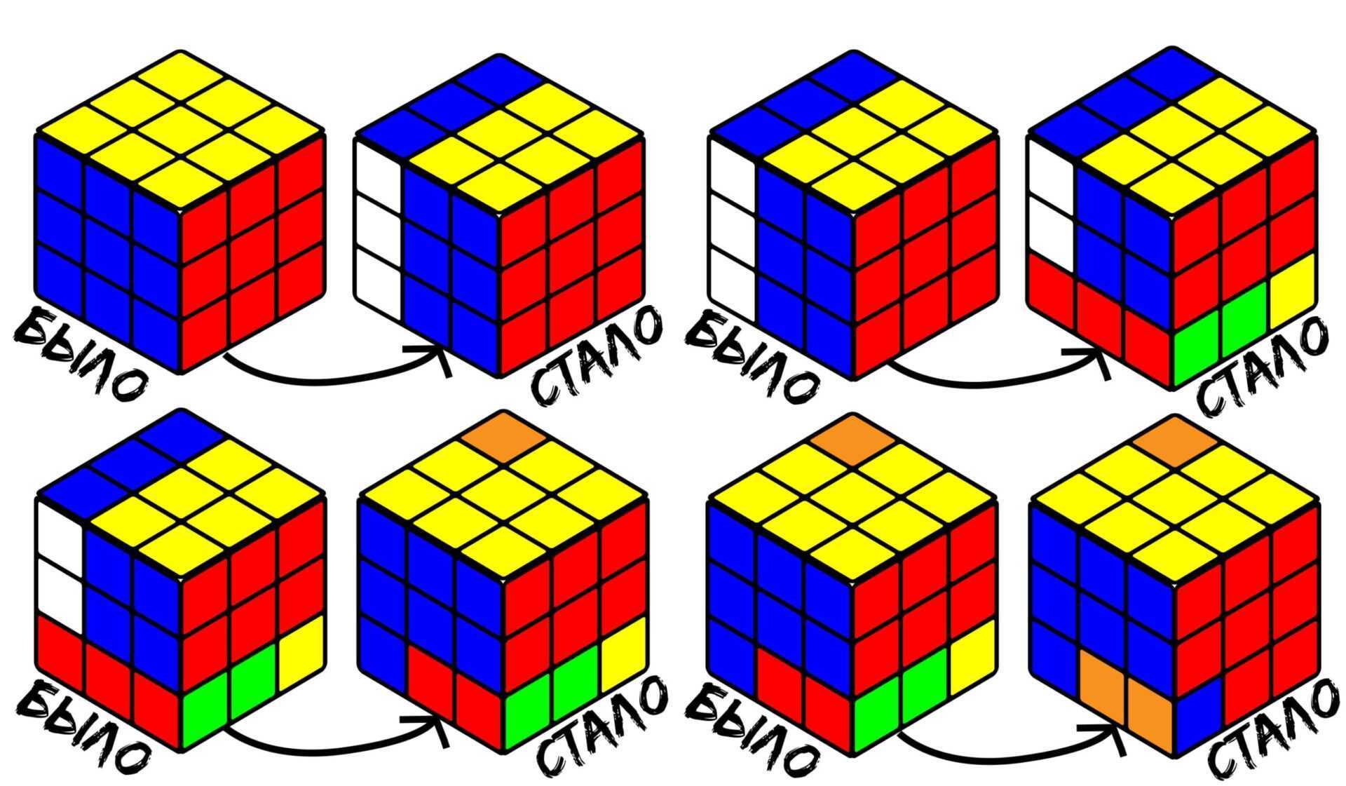 В стандартном раскладе обозначений подразумевается вращение по часовой стрелке. В случае, когда после буквенного обозначения стоит апостроф «‘», вращать нужно против часовой стрелки. Когда следом за буквой указана цифра «2», значит, нужно вращать грань дважды на 180°.