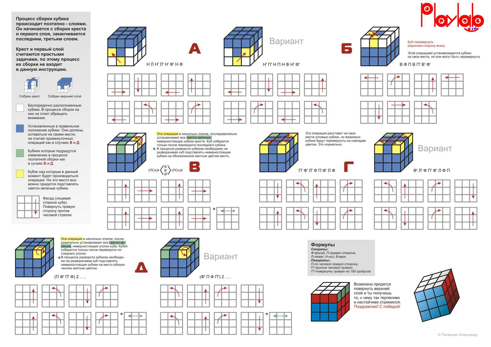 Такая схема считается самой простой и отлично подходит и для детей. Начинается со сборки крестика, иными словами на каждом ребре должен быть одинаковый цвет центральной плашки и угловых элементов. В начале сборки кубик Рубика обязательно должен быть разобран. Схема сборки 3*3 в 8 этапов.