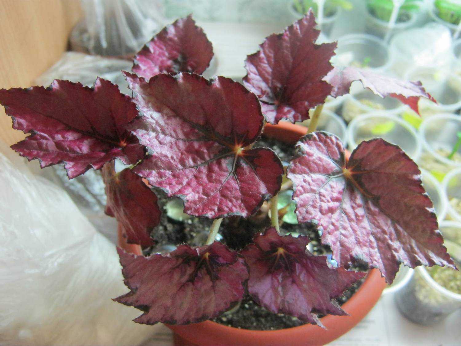 Подросшие бегонии высаживают с комом земли в небольшие горшки. В июле-августе такие растения зацветают, а к зиме успевают образовать клубни. Листовые бегонии легко размножаются листовыми черенками или разделением куста при пересадке.