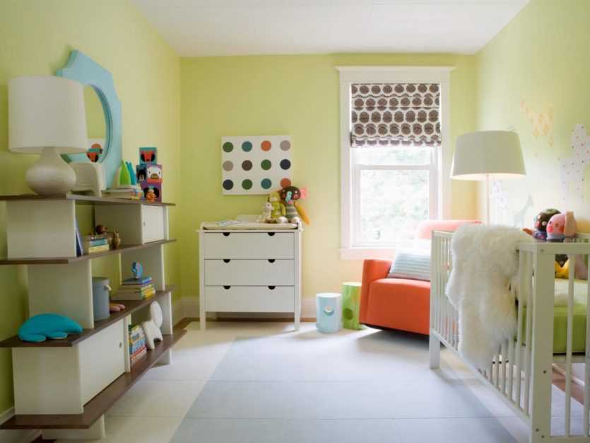 Светло-зеленая детская с акцентными элементами цветов теплой палитры