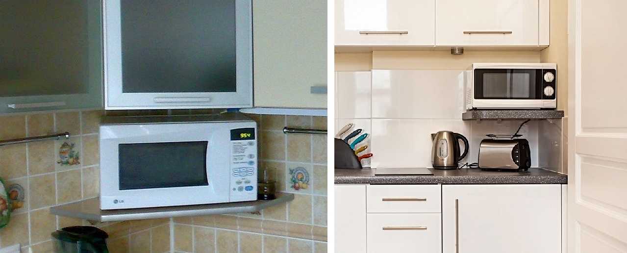 Также есть полочки для микроволновой печи с подставкой. Это когда не только кронштейны и полка, но и задняя стенка. Такие варианты хороши, но нужно постараться сделать полку глубокой. Не все модели микроволновых печей можно интегрировать. В обычных должна оставаться воздушная прослойка до стены