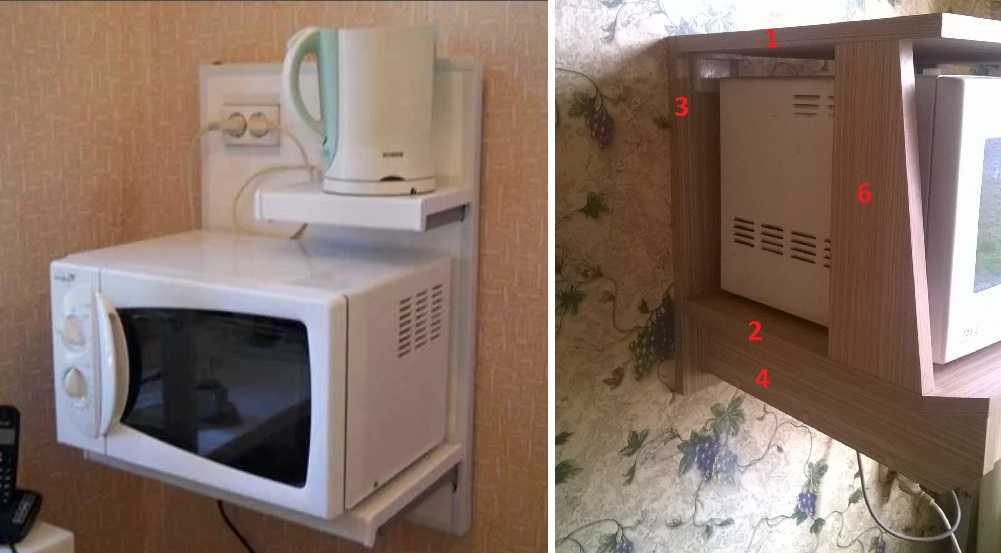Бытовой прибор можно установить на полку, которую несложно выполнить самостоятельно или приобрести в магазине. Это обычная полка, прикрепленная к стене с помощью 2-3-х кронштейнов. Производители выпускают и сложные многоярусные полки из металла (нержавейка, сталь никелированная или покрашенная, оцинковка), ламинированной ДСП, покрашенного дерева.