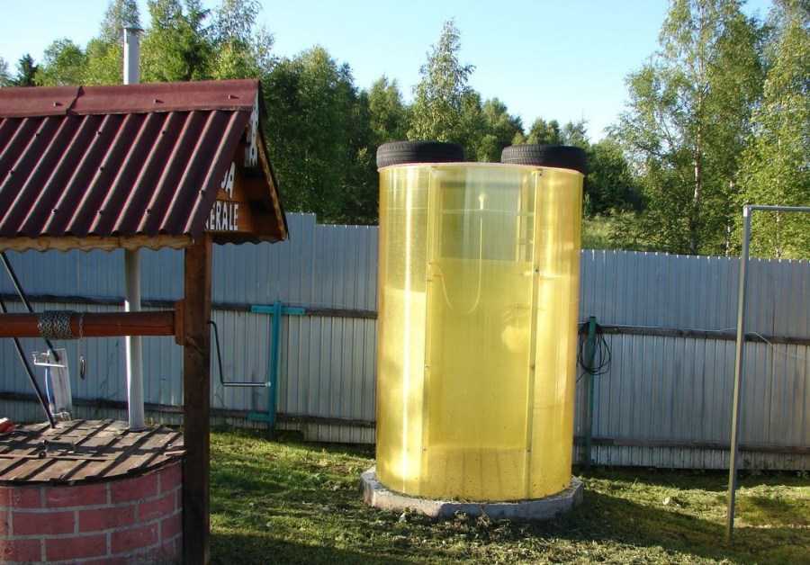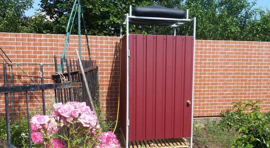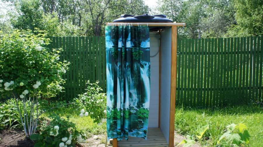 - Более сложная конструкция представляет собой небольшую кабинку из подручных материалов, к примеру, натянутого на металлический или деревянный каркас брезента, с выведенным наружу баком, который может нагреваться на солнце. Баки преимущественно используются пластиковые и металлические.