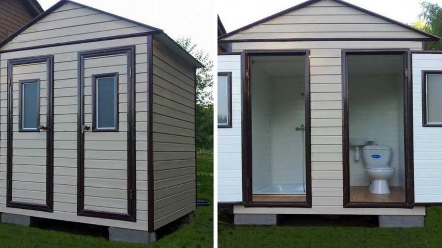 На следующем этапе делается стандартная сварка конструкции, затем бетонная стяжка для пола, в которую зарываются вертикальные стойки. После чего — сварка рамки и установка петельной двери. Остается облицевать кабинку строительными листами, пленкой или другим водостойким материалом.