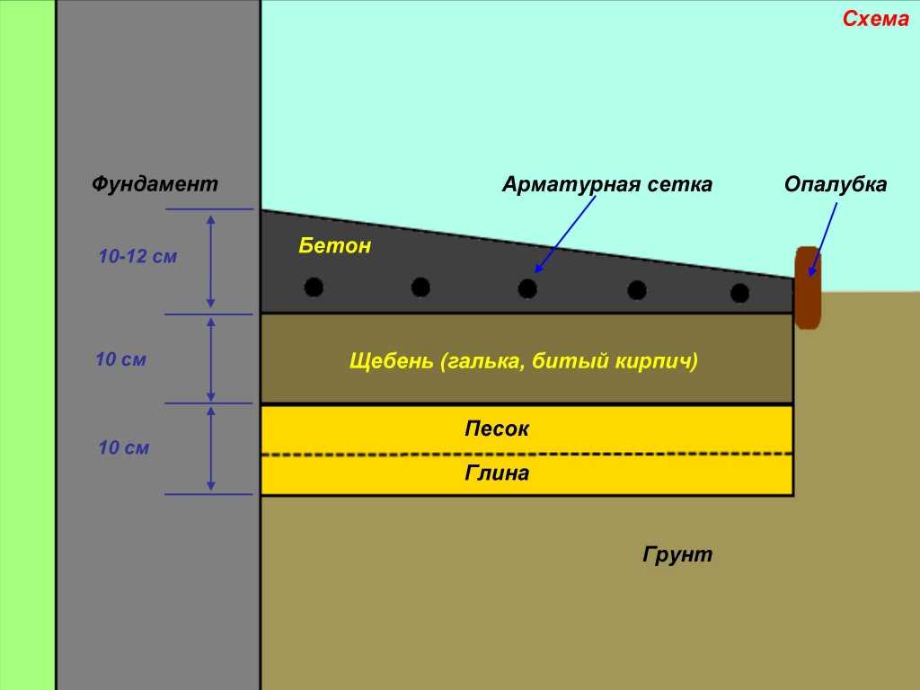 Пирог состоит из слоя песка толщиной до 10 см и щебня ‒ до 10 см. Армирование сеткой или проволокой из металла обязательно. Сверху принято заливать жидкий бетонный раствор, потом – выравнивающую стяжку.