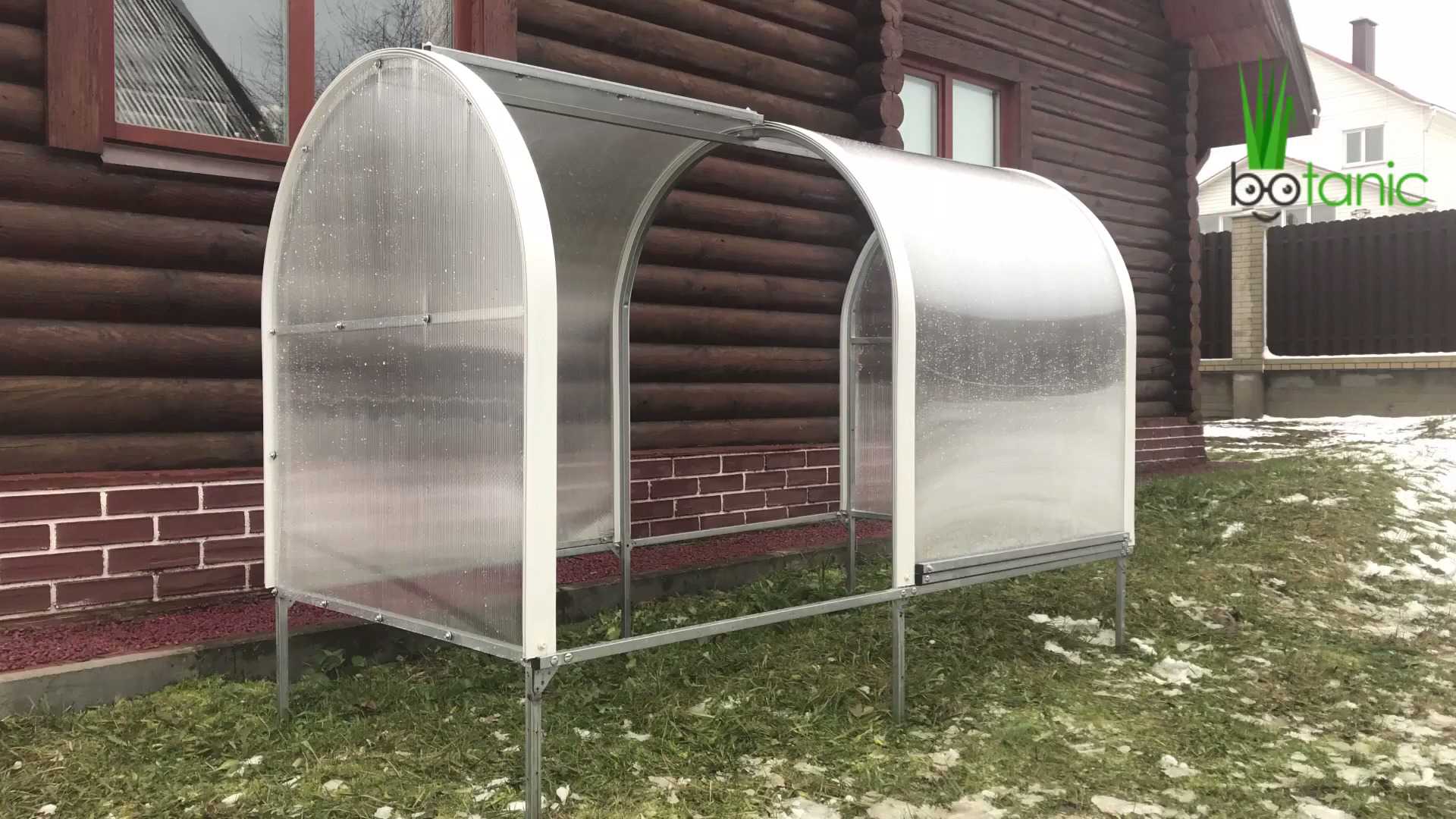 - Немного сложнее конструкция бабочка арочного типа с открывающимися створками по бокам. Металлический каркас покрывается поликарбонатом. По аналогии можно сделать деревянный каркас двускатной крыши и накрыть пленкой. Такая конструкция напоминает по форме домик.
