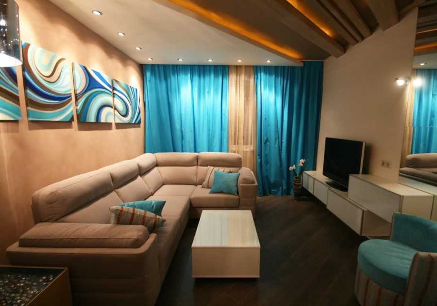 Визуально добавят несколько квадратных метров зеркала в шкафах. Не стоит использовать множество мелкого декора в гостиной – это будет «дробить» апартаменты. Как вариант можно использовать синий цвет для отделки поверхностей и декора. В таблице приведены оттенки, гармонизуемые с синими тонами.