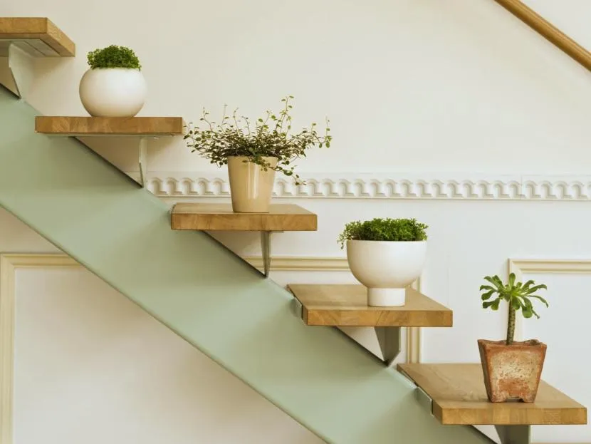 Стеллаж с наклонными полками-ступенями — у такого варианта свои плюсы: от возможности создания зеленой стены до экономии места. Уместен в недостаточно хорошо освещенных местах.