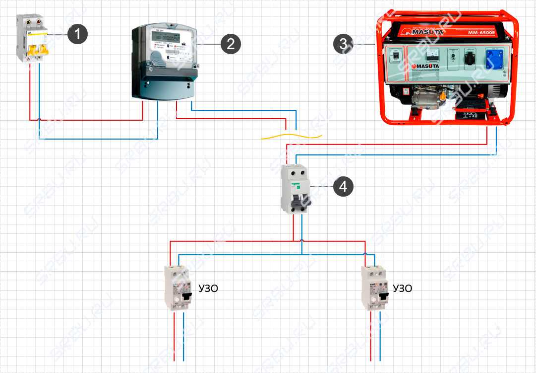 1. Вводной автомат. 2. Счетчик электроэнергии. 3. Генератор. 4. Распределительный автомат. 5, 6. УЗО.