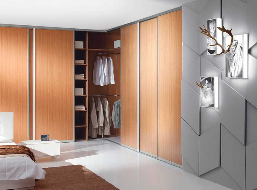 Если площадь помещения позволяет, угловая мебель для хранения делается на заказ и превращается в полноценную гардеробную или вместительную кладовку.