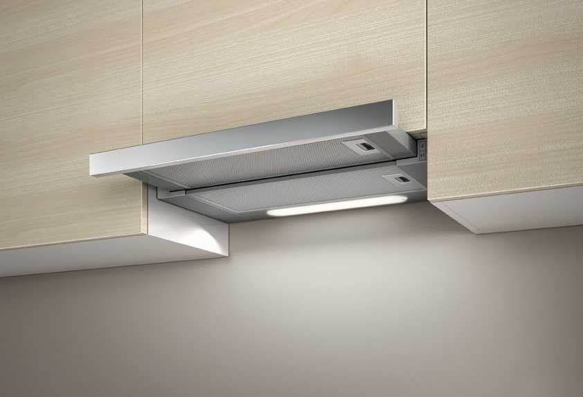 Для этого варианта установки подходят встраиваемые и плоские виды вытяжек с функцией рециркуляции. Они прекрасно подходят для семей, где приготовление пищи происходит довольно редко и больших вытяжных мощностей не нужно