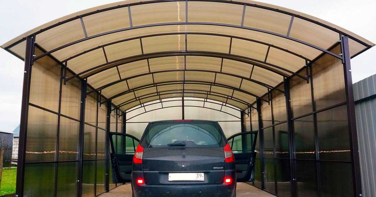 - закрытые – дополнительно оснащены стенками из дерева, поликарбоната металла, способны защитить автомобиль при «косых» дождях.