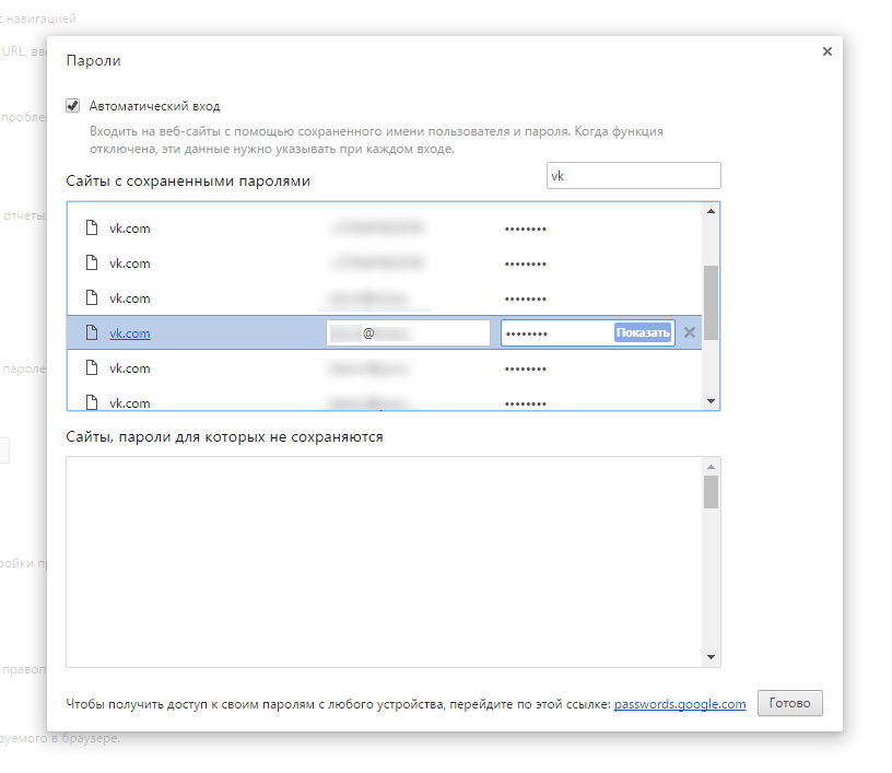 - Зайти на страницу, где будет полный список всех паролей для разных сайтов и сервисов.