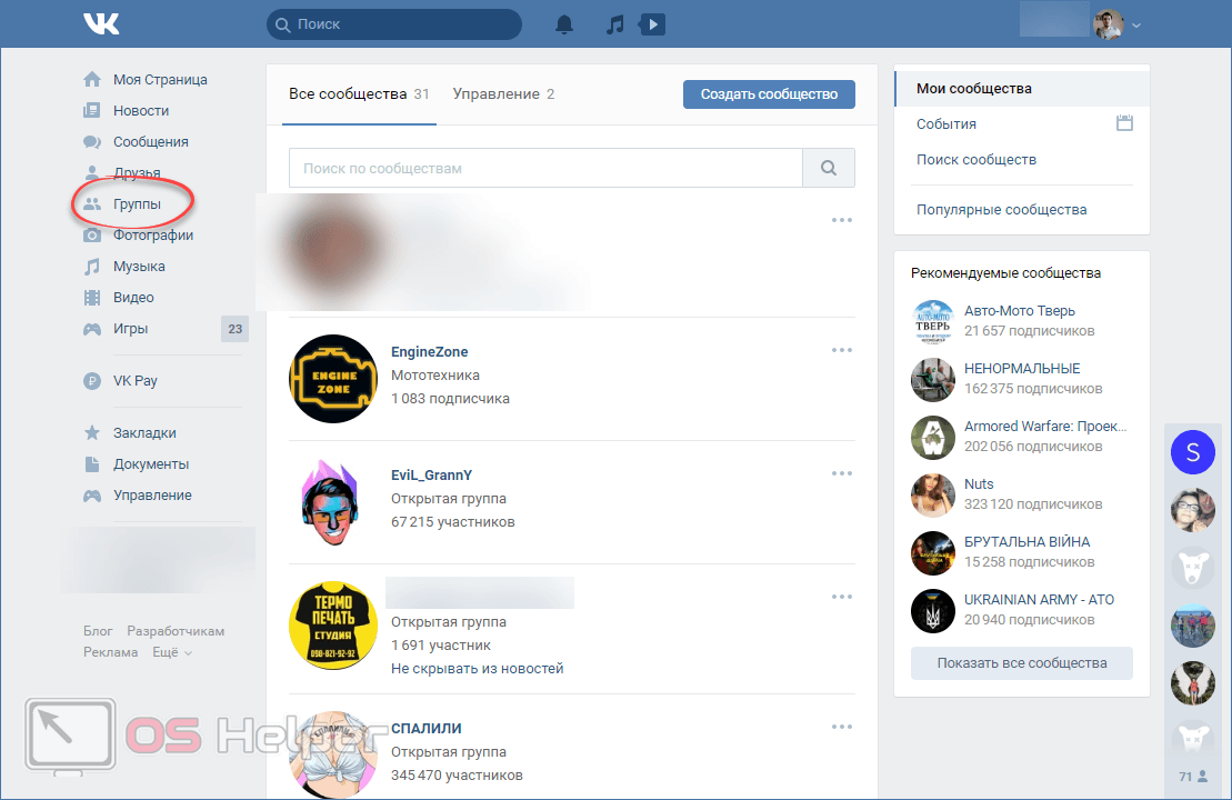 Далее у нас идут группы, в которых мы состоим. Отсюда же их можно удалять.