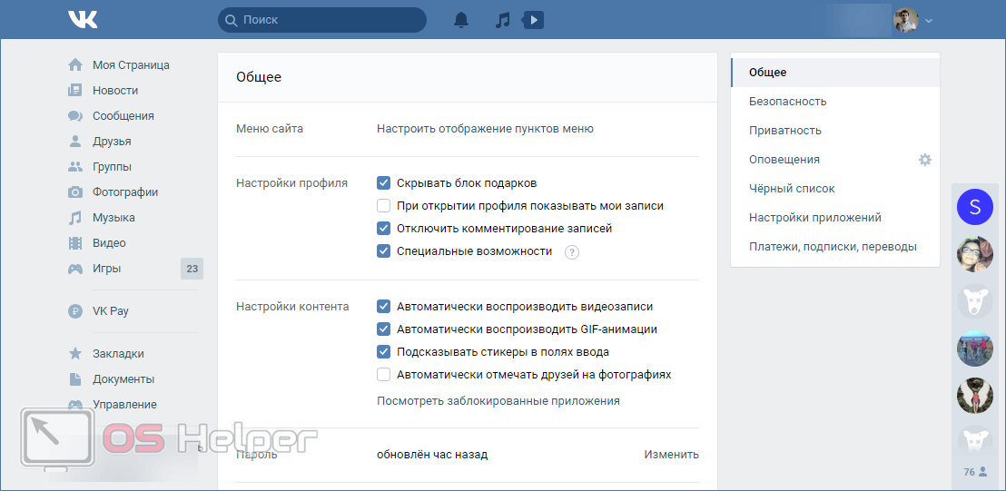 - Общее. Настройка меню сайта, профиля, контента, смена пароля, электронной почты, номера телефона и т. д. Тут же присутствует возможность удаления своего профиля в ВК.
