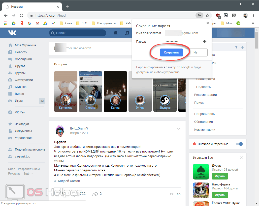 Если вам надоело постоянно вводить пароль, то чтобы сразу открыть «мою страницу» ВКонтакте, используйте запоминание данных браузером. Однако, помните, если это рабочий ПК или компьютер, который вам не принадлежит, сохранять пароль нельзя, иначе любой, кто запустит Windows после вас, сможет войти в аккаунт ВК.