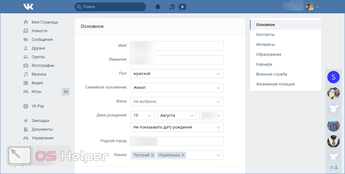 Раздел «Основные» содержит в себе главные настройки, такие как: имя, фамилия, пол, семейное положение и т. д.
