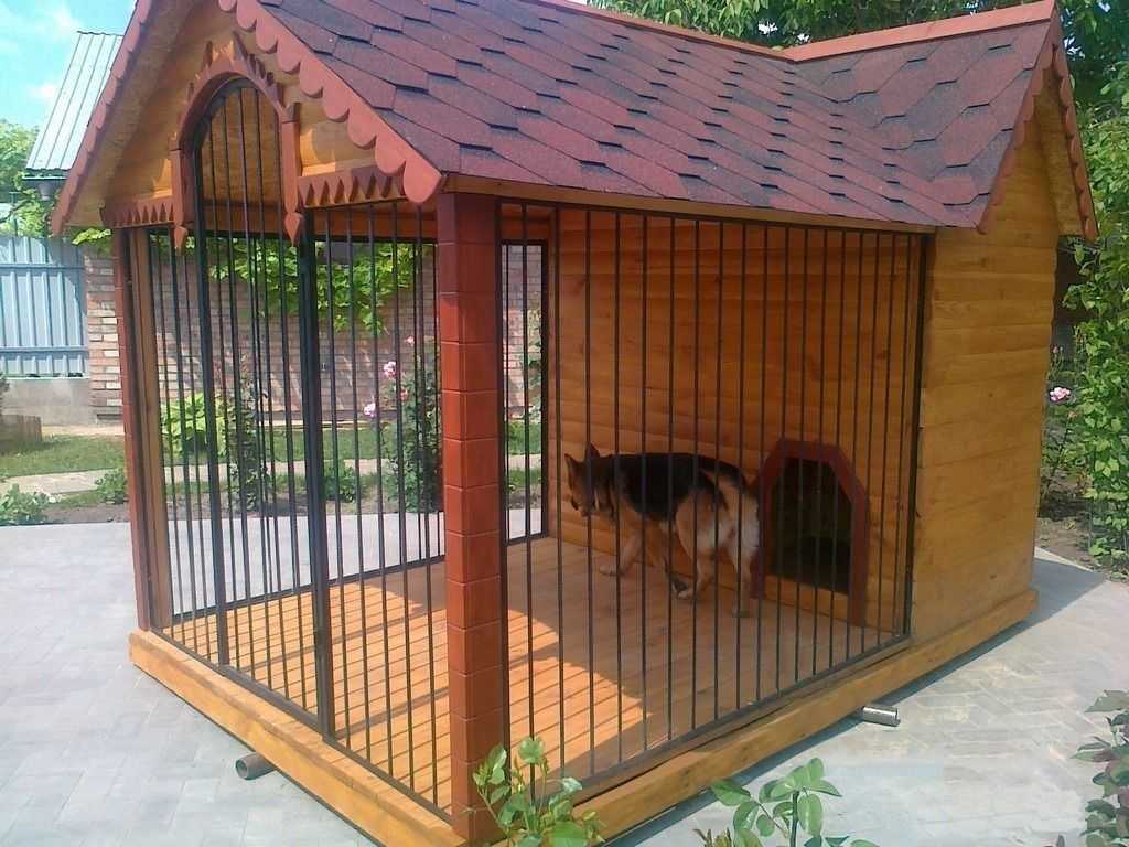 - Для лета. Подобные вольеры отличаются большой территорией для прогулок. В них также есть будка либо навес, чтобы пес мог спрятаться в плохую погоду. В таких конструкциях две стенки делают из решетки, а другие полностью зашивают деревом.