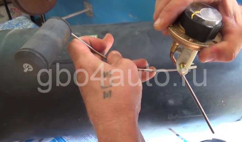 Отрегулировать поплавок на новом «мультике» таким образом, чтобы датчик показывал правильное количество газа в баллоне. Делать это следует аккуратно, сгибая крепление поплавка таким образом, чтобы при максимальном положении стрелки на датчике уровня газа поплавок также находился в максимально высоком положении в баллоне.